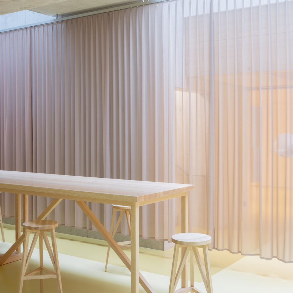 In collaboration with color designer Katrin Oechslin and the architects, the offices were equipped with daylight curtains while the lobby was enriched with an artistic color gradient printed on the quality Georgette displayed in front of an acoustic curtain. This textile intervention gives the modern two-story building a sophisticated, high-quality architectural expression.