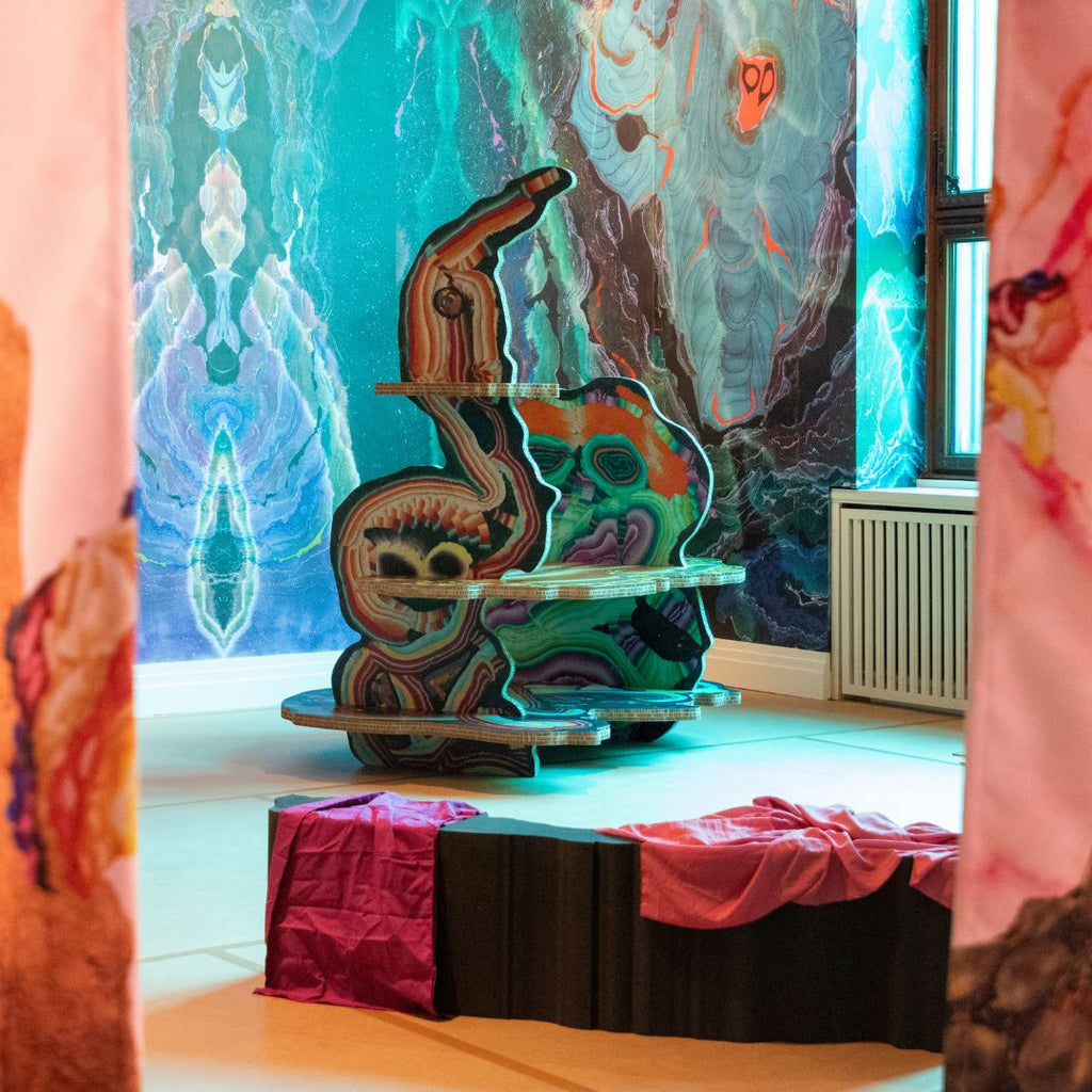 This immersive space invites visitors of all ages to rediscover the playful, childlike spirit within. The room is alive with colorful depictions of dinosaurs, mythical creatures, and marbling gemstones, brought to life on our Groovy fabric with exquisite recto-verso printing and vivid fossil-inspired prints on our Tulle 300, creating an enchanting, textural interplay.