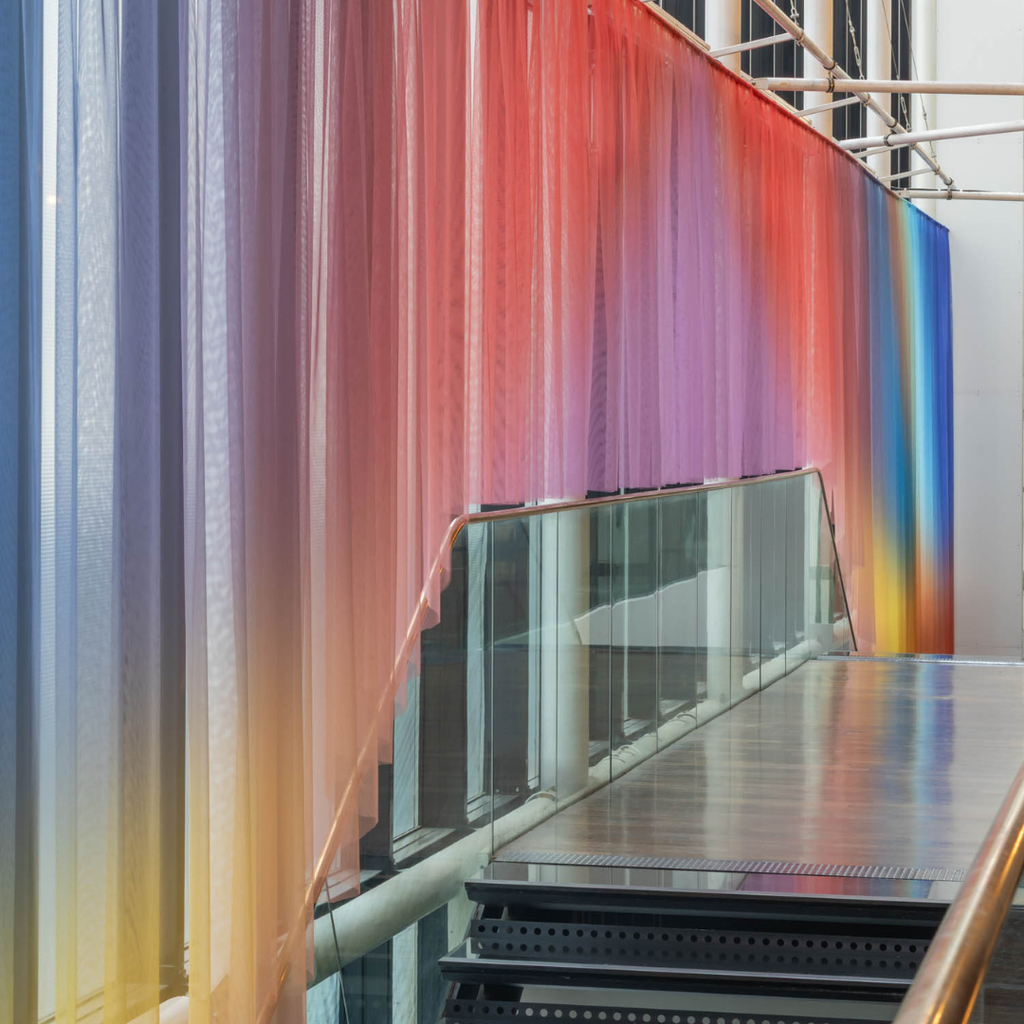 For this installation, 4Spaces produced a 26-metre tulle curtain, custom-printed and precisely shaped to follow the contours of the theatre’s grand staircase. The subtle gradient and delicate transparency of the design transform the foyer, creating a play of light and reflection reminiscent of a cathedral — a poetic dialogue between architecture, colour, and atmosphere.